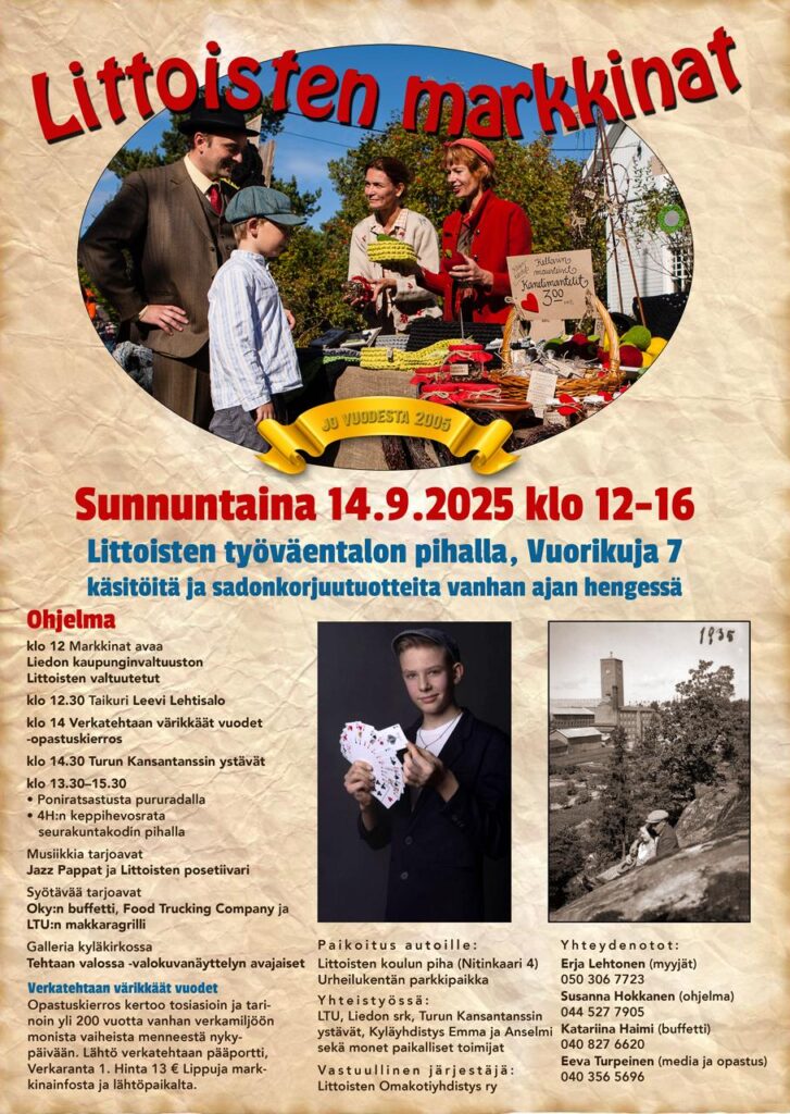 Perinteiset käsityö- ja sadonkorjuumarkkinat, jossa lämminhenkistä kylätunnelmaa. Tarjolla taikatemppuja, poniajelua, musiikkia, kansantanssia. Lisäksi Tehtaan valossa -valokuvanäyttely Littoisten kirkossa sekä Verkatehtaan värikkäät vuodet – opastuskierros.